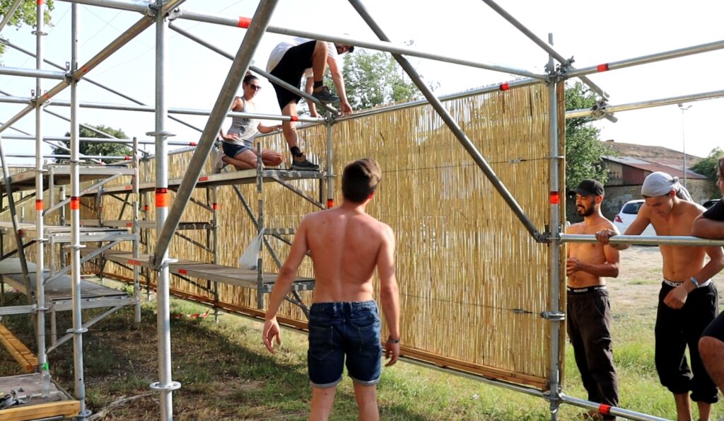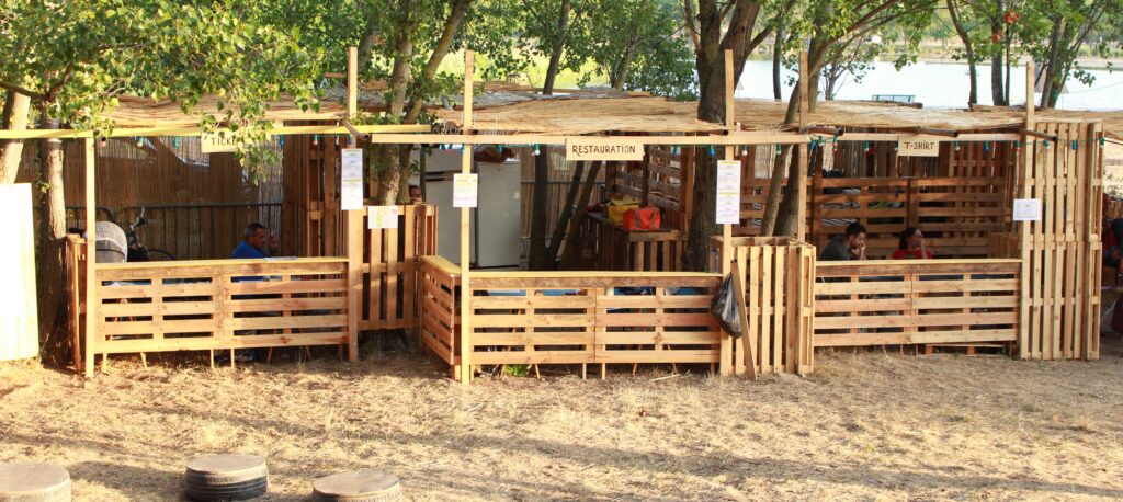 Les structures de convivialité en échafaudage sont habillées de canisses et de palettes en bois, les plans techniques sont éprouvés pendant trois ans, imposant tout deux ingéniosité et adaptation, pour répondre aux contraintes de budget et de site arboré.