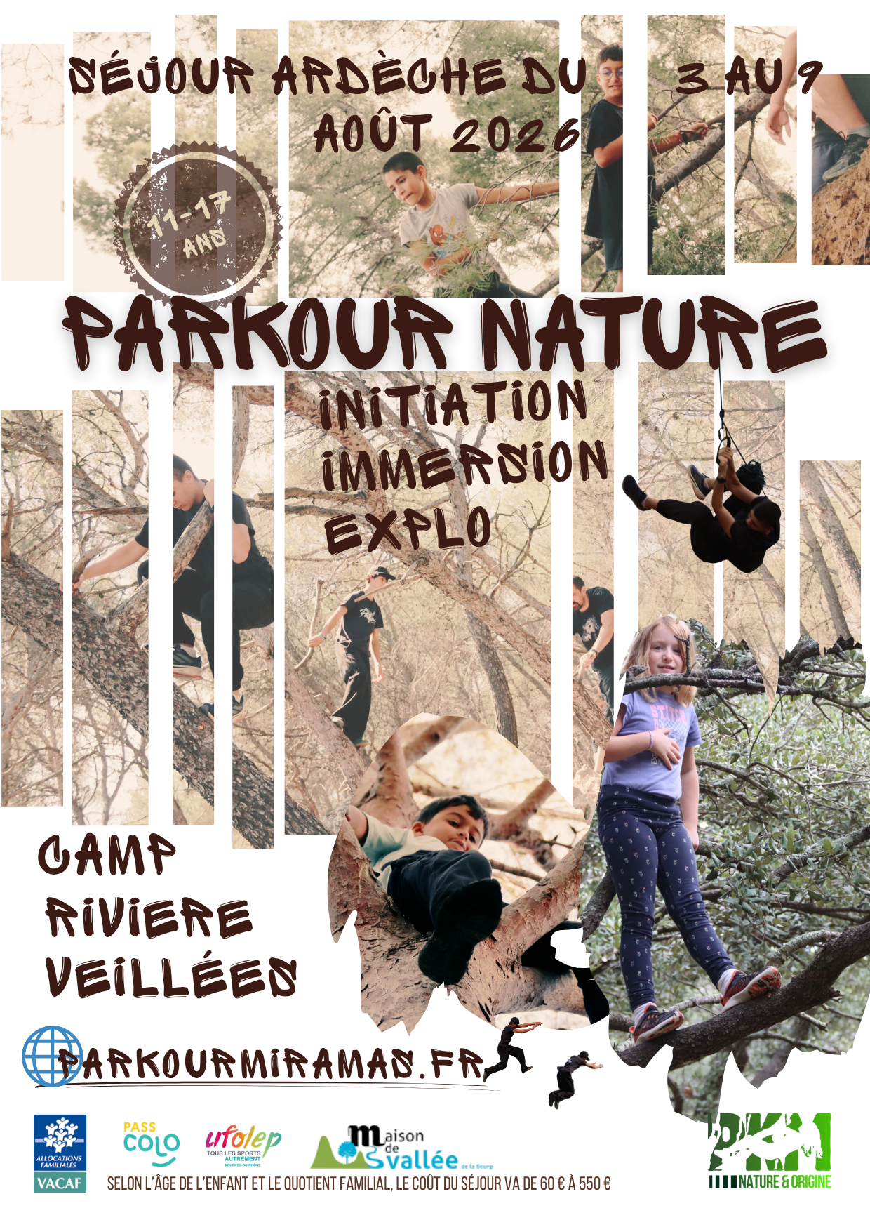 Le séjour est centré sur la pratique du parkour en milieu naturel. La vie en bivouac et l’itinérance constituent le cadre d’hébergement et d’organisation du quotidien.